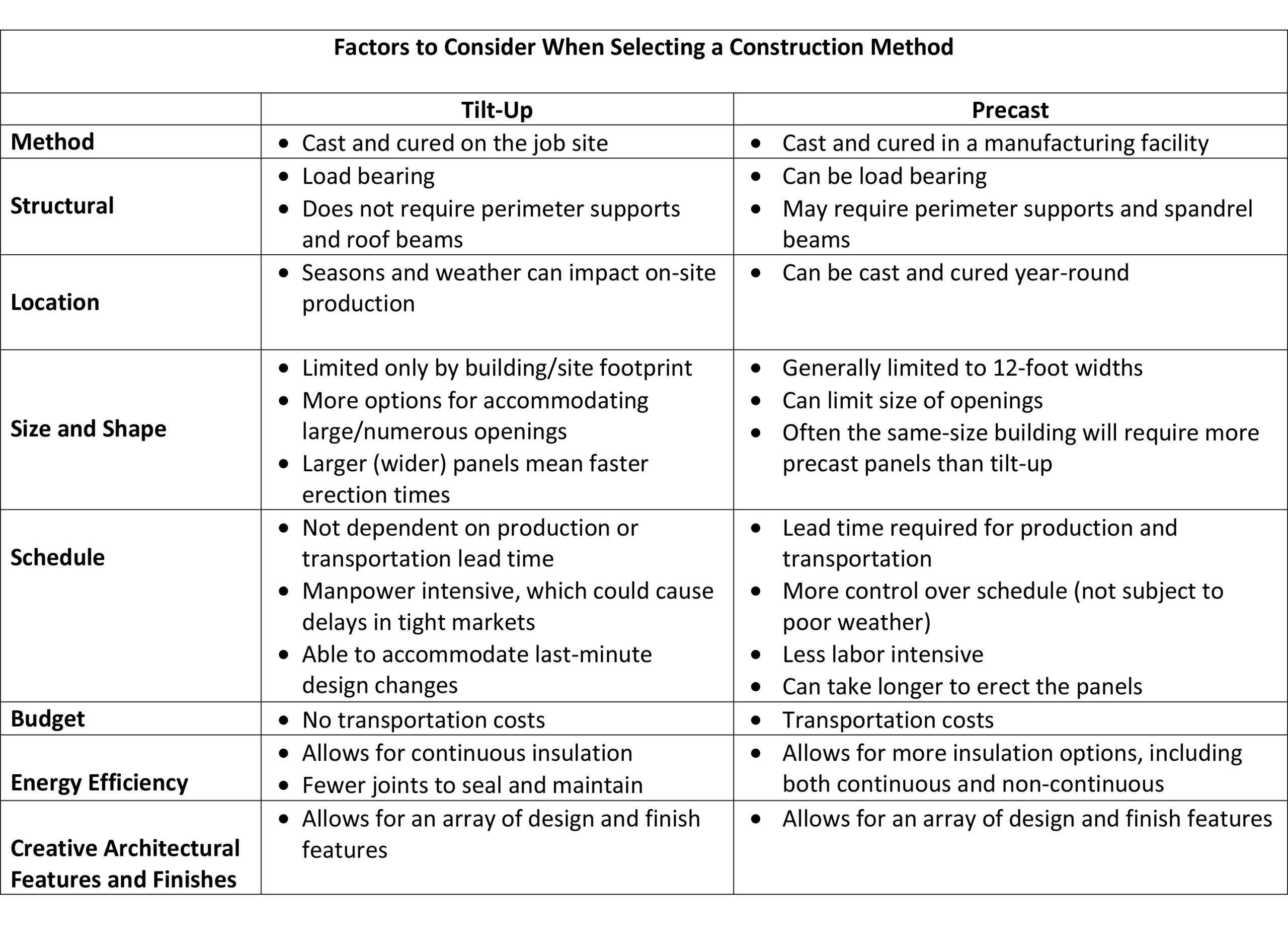 There are several factors that building owners need to consider before choosing tilt-up or precast, some of which are summarized in the table below. The good news is that both methods are proven and dependable.